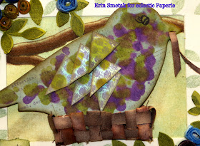 Here you can see the closeup of the bird. This was fun for me! I took a beige chipboard bird from an album that I have had for quite some time! I dropped purple and green alcohol inks all over the bird and then dropped Alcohol Ink Blending Solutions to further blend the two colors. Then, I stamped banners from Dylusions Bags of Bunting, sponged on top and then sponged the edges. I did drop green ink on each "wing" as well. I also threaded a piece of canvas through its mouth as if it was building its nest.